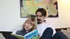 LESER: Emil Høye Hammerlin er forfatter. Her leser han fra boka «Emils bok» sammen med pappa Joakim.