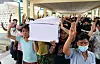 DEMONSTRANTER: Folk i Myanmar demonstrerer mot militæret der. Her bærer de en kisten til en mann som døde i opptøyene i helgen.